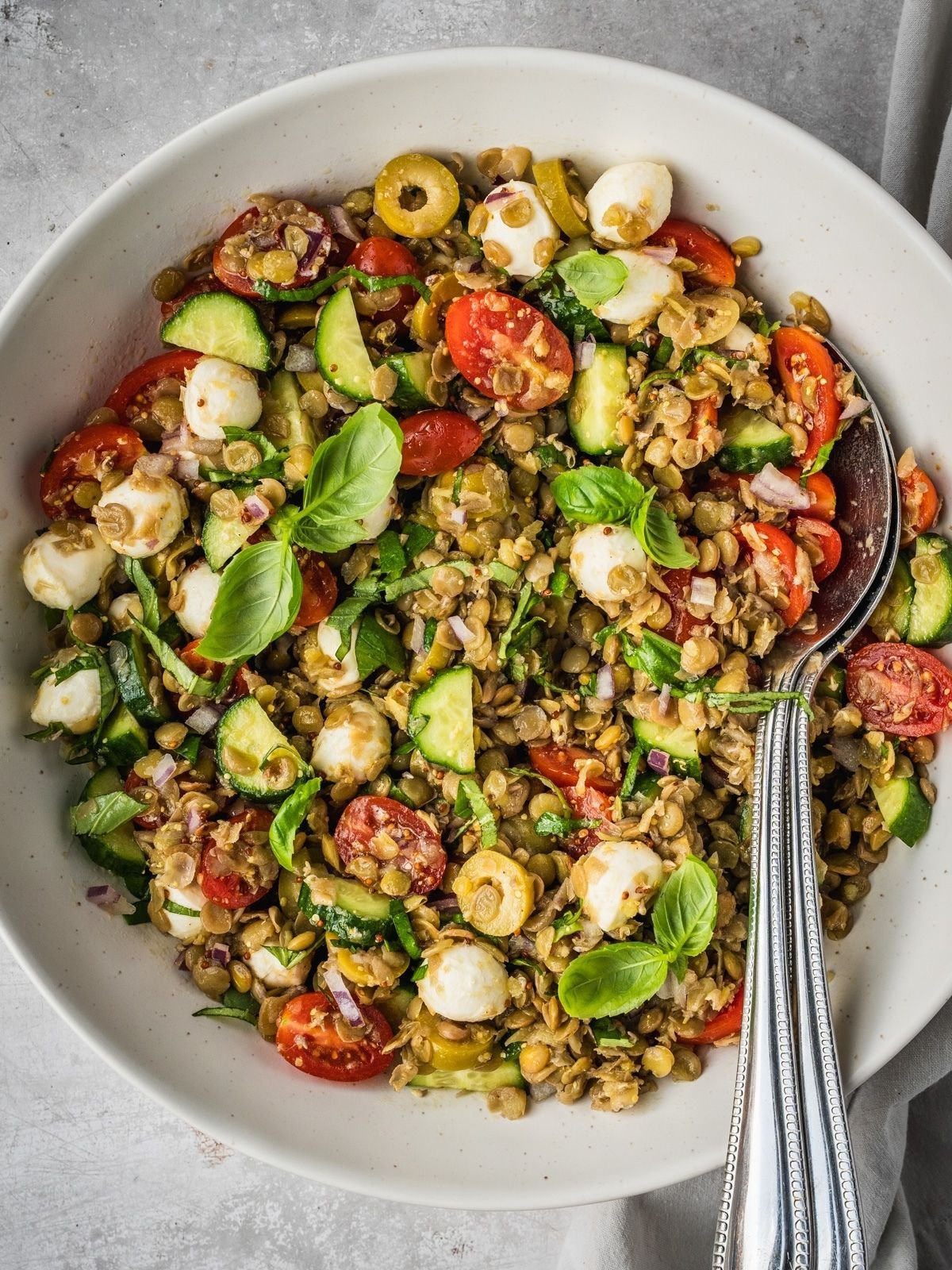- Assemble the Salad. To the bowl with the dressing, add the cooked and drained lentils, 1 pint Cherry tomatoes (sliced in half), 2 Persian cucumbers (chopped), 1 cup Mozzarella cheese balls, ½ Red onion (finely chopped), ¼ cup Green olives (chopped), and 2 tablespoon Fresh basil (chopped).