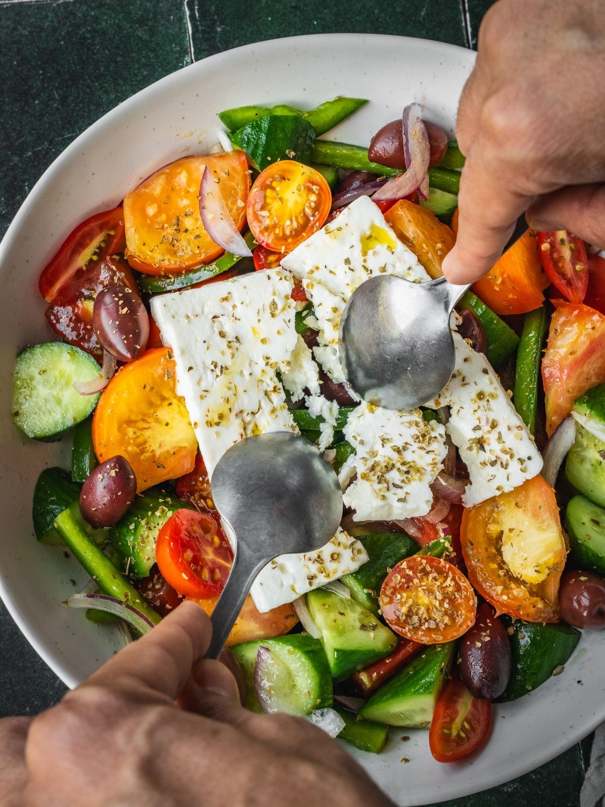 Step 4. Add Cheese and Serve. Place a large chunk of feta on top of the salad. Sprinkle with a pinch of dried oregano and drizzle with a little extra olive oil. Serve immediately or at room temperature.